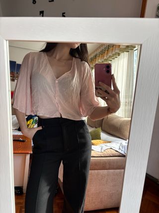 Elegante conjunto de fiesta de Zara. - Blusa sin mangas con volantes. - Pantalón largo con detalle de encaje en los laterales y bajo.