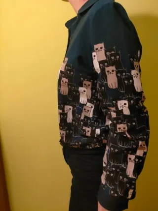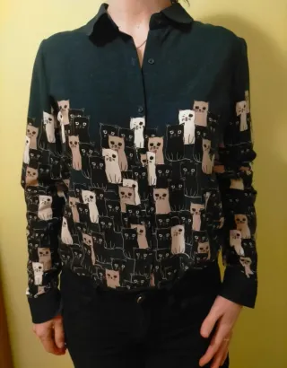 Blusa de manga larga con un divertido estampado de gatos en tonos beige y negro. El cuello es de blusa y tiene cierre de botones. - Diseño de gatos en toda la prenda. - Cuello camisero. - Cierre frontal con botones. Bien conservada, tiene un estampado que enamora, gatitos de diferentes colores que algunos guiñan un ojo. Azul marino y todos crema. No necesita plancha.
