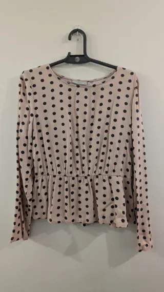 Elegante blusa de Zara con un diseño de lunares. - Tejido satinado. - Estampado de lunares en color rosa. - Mangas largas abullonadas. - Cintura elástica fruncida.