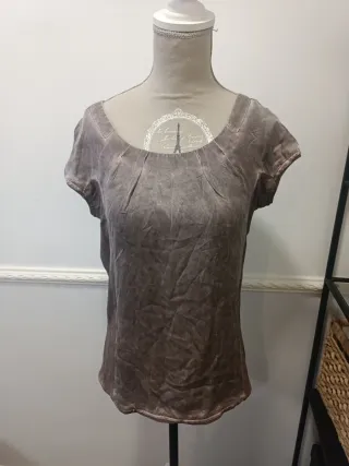 Blusa seda Adolfo Domínguez Talla XS diseño drapeado en el cuello. - Manga corta. - Acabado suave y ligero. - Detalle de pliegues en la parte delantera. En muy buen estado.
