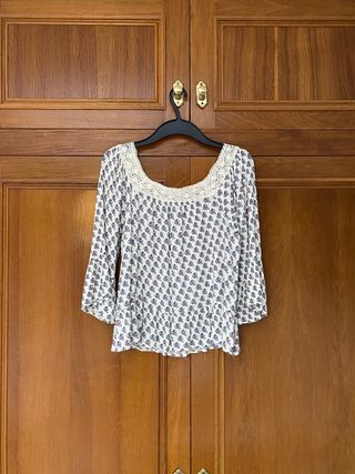 Blusa estampada de manga ancha con volante. Talla S. En buen estado. Pocos usos. Se pueden hacer lotes de tres blusas