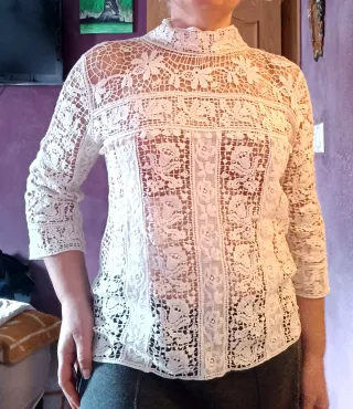 Elegante blusa de encaje estilo irlandés con un diseño intrincado y detalles florales. - Cuello cisne - Mangas tres cuartos - Tejido de encaje calado.