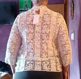 Blusa de Shein con un diseño veraniego y ligero. Perfecta para combinar con diferentes outfits. Talla XL amplia - Tejido calado con detalles. - Cierre de lazada en la parte delantera. - Manga larga.