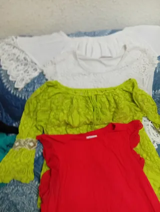 Lote de cuatro blusas con detalles de puntilla. - Diseño con cuello elástico. - Mangas acampanadas con adornos. - Tejido ligero y con textura.