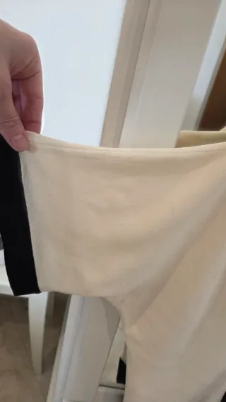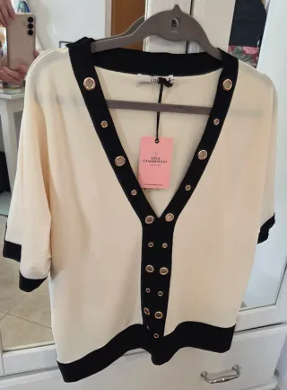 Blusa de punto con detalles en contraste. - Ribete negro en cuello y mangas. - Detalle frontal con ojales dorados. - Diseño de manga corta.