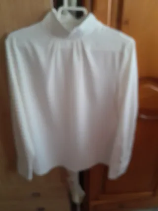 Elegante blusa blanca con cuello alto y detalles fruncidos en la parte delantera. Ideal para un look sofisticado. - Manga larga. - Tejido ligero y fluido.