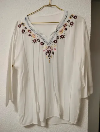 Blusa ligera con un diseño bordado en el cuello y detalles de flecos. - Cuello en V con cordones y borlas. - Mangas 3/4. - Bordado multicolor en la parte delantera. Es talla única pero para talla M va bien.