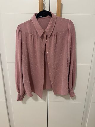 Elegante blusa de Mango con un diseño de doble capa y manga acampanada. Talla XS. - Color beige rosado. - Tejido ligero y fluido. - En perfecto estado.