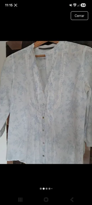 Blusa de manga larga con un delicado estampado floral en tonos azules sobre fondo blanco. Presenta un cuello mao y cierre de botones. - Diseño con detalles de encaje en la pechera. - Mangas tres cuartos. - Bajo asimétrico.