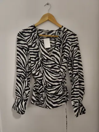 Blusa con estampado de cebra y diseño cruzado. - Manga larga. - Detalle de fruncido lateral con cordón. - Puños abotonados.
