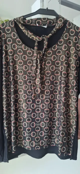 Blusa elegante con un llamativo estampado. - Diseño con cuello anudado. - Mangas largas. - Tejido con brillo metálico.