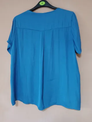 Blusa de manga corta con un diseño elegante y detalles en el cuello. - Cuello redondo con pequeños adornos. - Mangas cortas. - Corte holgado. En la etiqueta figura talla 46 pero por las medidas corresponde a una XL