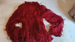 Elegante blusa de color rojo con un diseño único y llamativo. Perfecta para añadir un toque especial a tu atuendo. - Tejido ligero y vaporoso. - Detalle de volantes en el cuerpo y mangas. - Mangas largas acampanadas con terminación de flecos. - Cuello alto con fruncido.