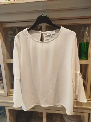 Blusa de manga francesa en color crudo. Para una talla 38-40 - Diseño con cuello redondo. - Cierre en la espalda. - Mangas con detalle de lazada.