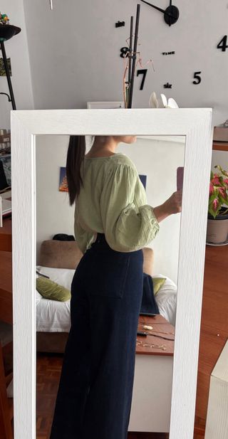 Blusa verde con manga 3/4, de la marca blanco talla s en buen estado - Diseño con fruncido en los hombros. - Mangas enrollables con botón. - Abertura en la parte inferior trasera con botones