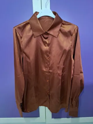 Elegante blusa de manga larga con un acabado satinado brillante, cuello camisero holgado de talla L. Medidas: Ancho 56cm Largo 65cm Nueva a estrenar