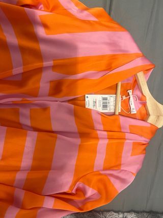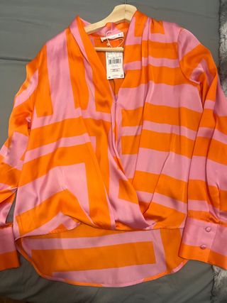 Elegante blusa con un llamativo estampado geométrico en tonos naranja y rosa. - Diseño cruzado. - Mangas largas con puños abotonados. - Bajo asimétrico.