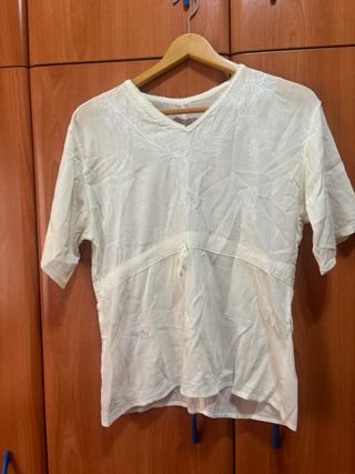 Bonita blusa con detalles bordados. - Diseño con cuello en V. - Mangas cortas. - Cordón ajustable en la cintura. - Tejido ligero y transpirable.