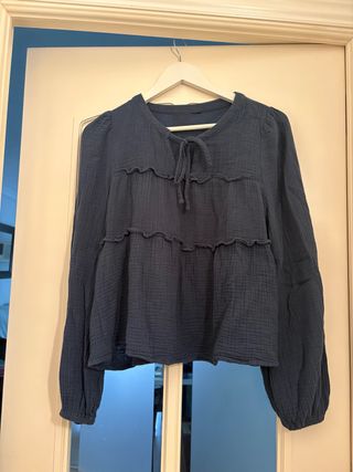 Blusa de H&M con un diseño plisado y un llamativo estampado. Talla 44 de HyM Color azul marino oscuro y blanco. Sólo usada en dos ocasiones. Está impecable. - Mangas largas abullonadas. - Cuello redondo. - Cierre de botón en la nuca. - Puños y bajo elásticos. De axila a axila 64 cm. Largo manga 72 cm. Largo total 59 cm. Envío por Inpost. #blusabohochicmujer #blusaplisadamujer #blousefemme #blusaelegantemujer