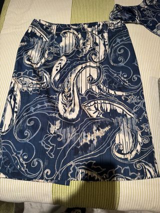 Elegante conjunto de falda y blusa de seda con un llamativo estampado. - Falda de corte recto, de Algodon - Blusa con mangas corta con un tejido de seda suave al tacto.