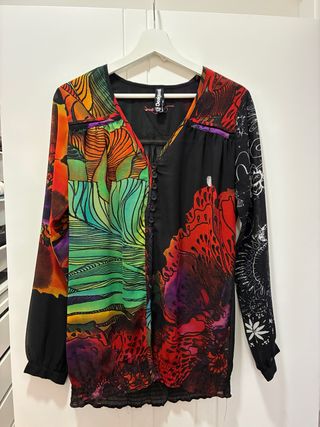 Elegante blusa semitransparente con un diseño vibrante. Se hace envío. - Mangas largas con puños fruncidos. - Estampado circular en tonos azules. - Detalle de botones en el escote. - Bajo elástico con volante. Blusa negra estampada. Marca Desigual. Cintura elástica. Talla M. Muy buen estado. 100% Poliéster.