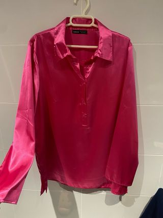 Blusa color buganvilla de manga larga y diseño cruzado. El tejido es elástico y plisado y tiene la cintura terminada en volante. Talla 38/40. En muy buen estado, usada solo una vez.
