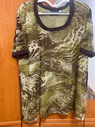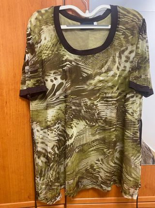 Blusa de manga corta con un llamativo estampado en tonos verdes y marrones - Comprada en C&A de la coleccion Sixth Seven - Diseño con cuello redondo. - Acabado en los puños y cuello en color marrón. - Lazada para ajustar en la espalda -Puesta solo en una ocasión