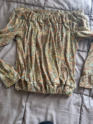 Bonita blusa de Mango con un estampado vibrante y diseño de hombros descubiertos. - Mangas largas. - Cintura elástica. - Tejido ligero y fluido.