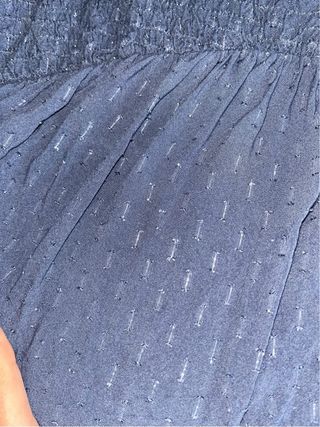 Gasa ligera sin mangas. Ajuste holgado y dobladillo transparente. Escote y hombros con plisado o tejido de malla/plumeti con lunares en relieve semitransparente. Faldón de tablitas. Volantes fruncidos en los hombros. Cuello redondo con abertura en forma de lágrima y cierre de botón en parte trasera. Pliegue en espalda. Con vuelo. Medidas: 59largo, 47sisa. Precio no negociable.