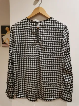 Elegante blusa con un clásico estampado de pata de gallo. - Diseño de manga larga. - Cuello redondo con detalle de cierre en la nuca.