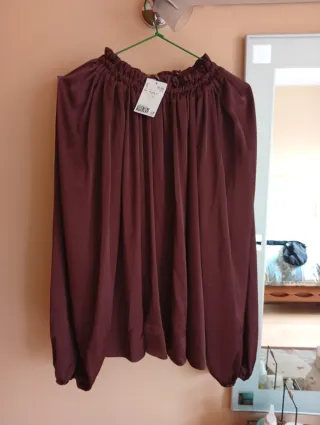 Blusa elegante de manga larga con un diseño moderno, talla L. Color burdeos. Nueva, sin estrenar. Medidas: ancho de pecho 50 cm, ancho de la parte baja 58 cm, largo por delante 64 cm, largo por detrás 72 cm. Hago envíos. En persona se entrega en la puerta del Domino's pizza de Avda Puente del Pilar.