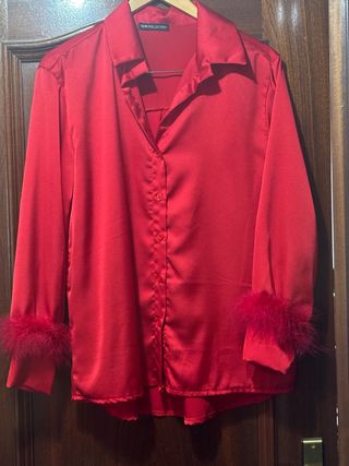 Blusa roja satinada con plumas