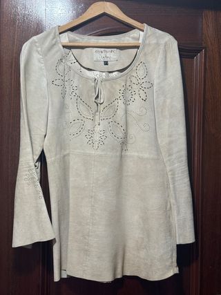 Elegante blusa de piel con un diseño único. - Detalle de calados florales en la parte delantera y en las mangas. - Cuello redondo con lazada. - Mangas acampanadas con perforaciones. - Material: Piel.