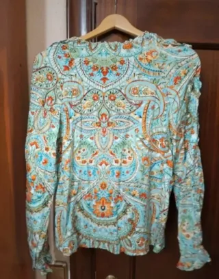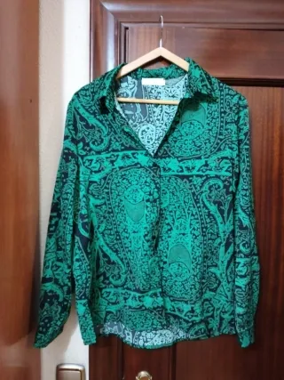 Blusa con un bonito estampado paisley, de Springfield, talla L. Nuevo, sin estrenar. Medidas: ancho de ancho 48 cm, largo 63 cm. Material viscosa. Hago envíos. En persona se entrega en la puerta del Domino's pizza de Avda Puente del Pilar.