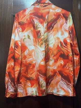 Blusa de manga larga con un vibrante estampado abstracto. - Diseño llamativo con tonos naranjas y marrones. - Cuello camisero y cierre de botones. - Puños con detalle de botón.