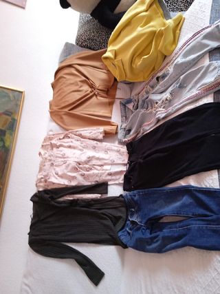 Foto 2 vestido o blusa S/M 4€, foto 3(vendida),foto 4 Pull&Bear S/M 3€, foto 5/6 la negra sin uso solo lavada S y la roja S/M cada una a 4€, foto 7 nueva solo lavada cogido el bajo Mango pone talla pequeña pero da para M/L a 15€, foto 9 pone talla pequeña pero da para S a 4€, solo use más veces la gris foto 3 y foto 4 las otras creo que un uso o ningún uso, envío sin devolución