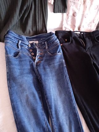Los Vaqueros pone 32/34 pero vale para S el roto a 3€, azul 3€ y negro a 2€ está más utilizado,blusas a 2€ cada o 5€ todas(la amarilla es de Zara) y el pijama muy buen estado a 3€ pone 11/12 años pero es una S