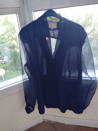Blusa de la marca April talla M. Color negro y botones dorados. Mangas ajustables. Anudada en la cintura queda ideal.🥰 Fina y algo transparente. Usada 2 veces. Está en perfecto estado.