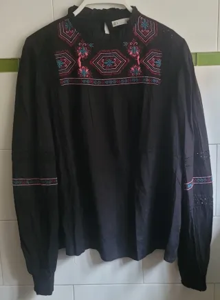 Blusa de estilo bohemio con un diseño único. - Mangas largas acampanadas. - Cuello cuadrado con detalle de bordados. - Adornos bordados en los hombros y puños. - Tejido ligero y con textura.