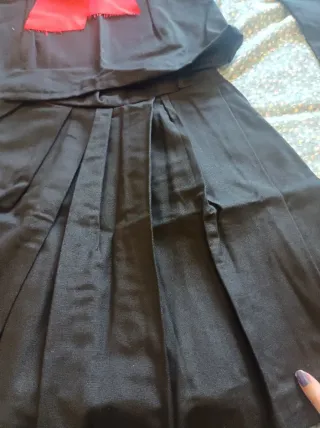 Conjunto de tres piezas que incluye chaqueta, blusa y falda. - Chaqueta con detalles morados. - Blusa negra con cuello decorado. - Falda larga con pliegues.