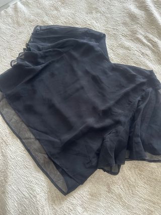 Preciosa blusa negra de estilo elegante. Es una prenda delicada y vistosa, ideal para cualquier ocasión. - Diseño de capas superpuestas. - Cierre trasero. - Sin mangas.