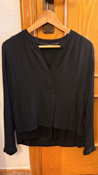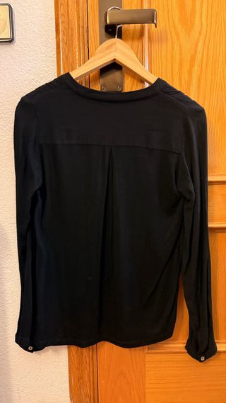 Blusa lisa de color negra con cuello camisero y 4 botones. Manga larga con puños abotonados con un botón. Tiene un cordón a nivel de la cintura que puede ajustarse. Extremos laterales inferiores con puntas redondeadas. Tejido fino y con caida, incluso un poco transparente. Sirve para embarazada por el diseño que tiene la blusa.