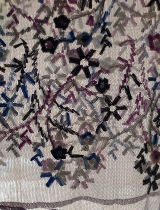 camiseta transparente con bordados en lila, azul, blanco,gris y negro ribete en cuello, puño y bajos