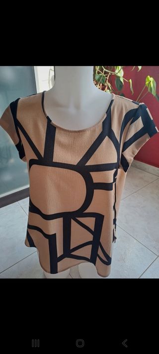 Preciosa blusa de la marca Only, talla S. Es de color beige con un estampado geométrico en negro. - Corte favorecedor. - Tejido suave y ligero. - Ideal para primavera/verano.