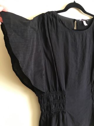Blusa negra Bimba y Lola en tejido de viscosa y poliéster. Diseño suelto con detalle de botones y pequeño volante en los hombros. Mínimo uso, está nueva. No conserva la etiqueta interior. Talla M: mide 41 cm de hombro a hombro, 52’5 de axila a axila, 57 de manga y 58 de largo.