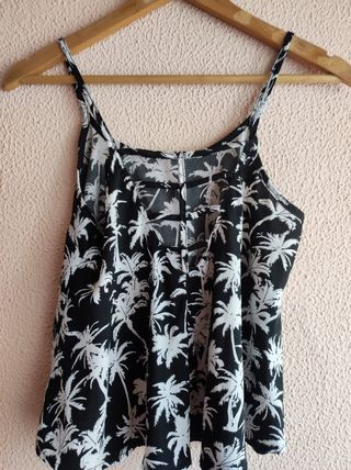 Blusa negra con palmeras blancas, como el yinyan del caribe. Tieme rejilla en la espalda para ir bien fresquita en verano. La vendo porque en Galicia tenemos más eucaliptos que palmeras y ya no me siento identificada. Talla S pero sirve para más que es sueltita. Marca Primark. En perfectísimo estado.