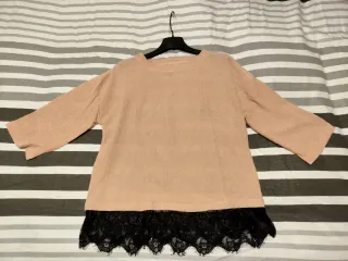 Blusa de manga francesa con un detalle de encaje en la parte inferior. La tela tiene una textura sutil. - Manga francesa. - Detalle de encaje negro en el bajo. - Talla S oversize,es muy amplia.
