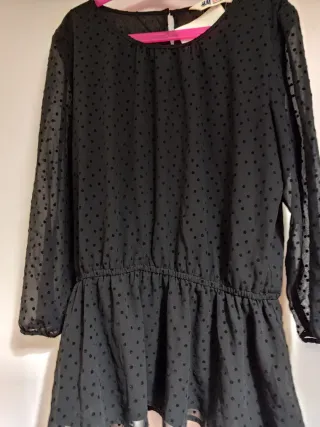 Elegante blusa negra de H&M con un diseño de lunares sutiles y detalles de transparencia. La goma en la cintura crea una silueta favorecedora. - Tejido ligero con estampado de puntos. - Mangas largas transparentes. - Forro interior para mayor comodidad.