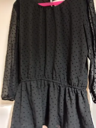 Blusa negra con pequeños lunares blancos, marca Spirit, talla 36. Muy poco uso, perfecto estado. Botones delanteros y detalle manga recogida.