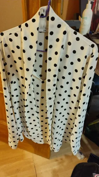 Camisa elegante con estampado de lunares. - Diseño de lunares negros sobre fondo blanco. - Tejido ligero y fluido.